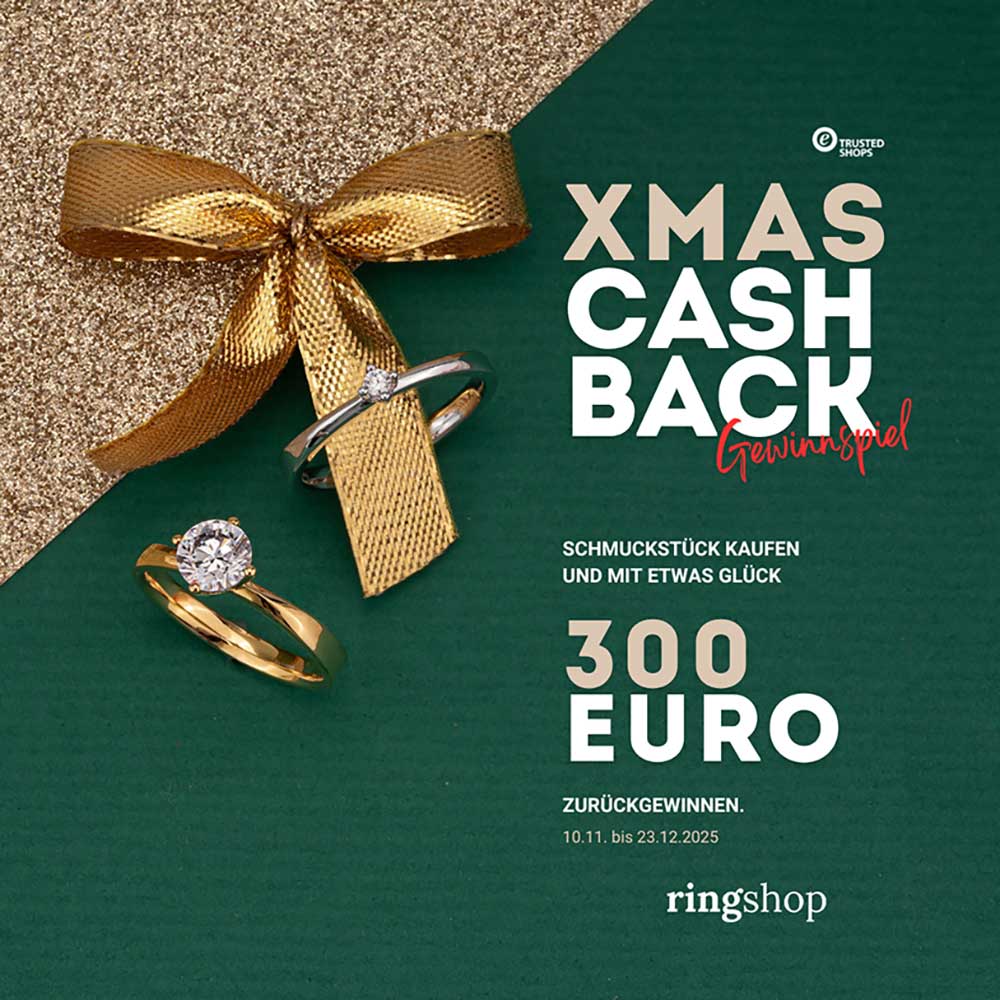 Alle, die zwischen 10. November und 23. Dezember 2025 im ringshop ein Schmuckstück kaufen, nehmen automatisch am XMAS-Cashback-Gewinnspiel teil! Mit etwas Glück bekommen Sie 300 € Ihres Kaufpreises zurück. Für Käufe unter € 300,- übernehmen wir gerne den vollen Kaufpreis. Der Differenzbetrag wird jedoch nicht bar oder unbar ausbezahlt.