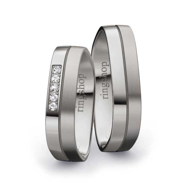 Palladium: Das mit Platin verwandte Metall Palladium erhält mit einem Feingehalt von 950/- eine besonders helle und strahlende Oberfläche. Mit einem Feingehalt von 500/- ist es deutlich dunkler wie etwa Graugold.