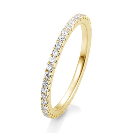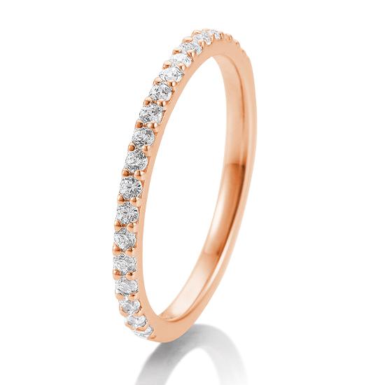 Ob klassisch-elegant mit einem einfachen Halbkreis aus Brillanten, vintage-inspiriert mit feinen Milgrain-Kanten und Gravurornamenten oder zweifarbig mit Kombinationen aus Gelb- und Weißgold – die Designmöglichkeiten sind vielfältig. Übliche Bandbreiten liegen zwischen 3 und 5 mm, wobei auch breitere Modelle bis zu 7 mm verfügbar sind, die dank präziser Anpassung ebenfalls komfortabel sitzen.