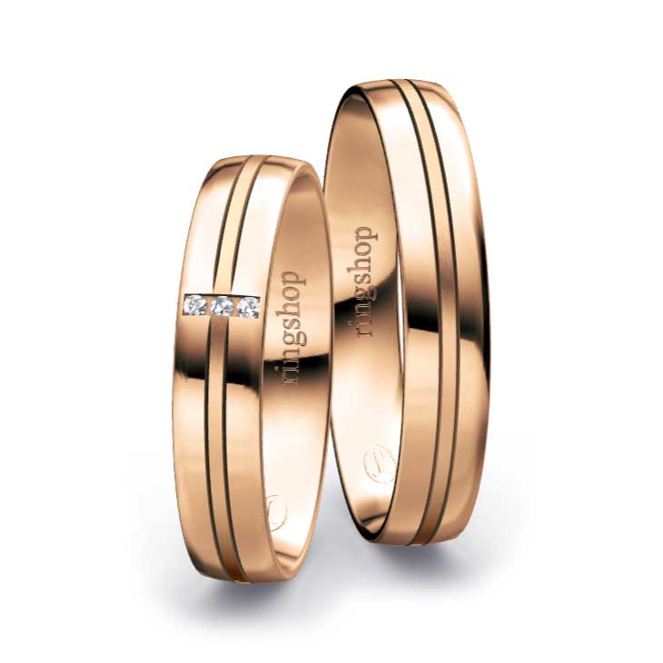 Rotgold: Es handelt sich um eine Legierung aus Feingold, Kupfer und Silber mit Goldanteilen zwischen 333/- und 750/-. Der etwas größere Kupferanteil sorgt für die namensgebende „rote“ Färbung und Härte des Materials. Der elegante und gleichermaßen zeitlose Farbton ist Kupfer ähnlich.