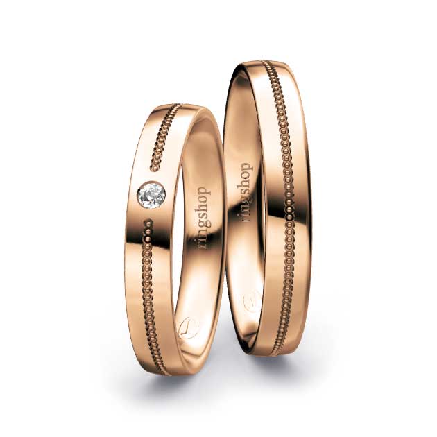 Rotgold: Es handelt sich um eine Legierung aus Feingold, Kupfer und Silber mit Goldanteilen zwischen 333/- und 750/-. Der etwas größere Kupferanteil sorgt für die namensgebende „rote“ Färbung und Härte des Materials. Der elegante und gleichermaßen zeitlose Farbton ist Kupfer ähnlich.