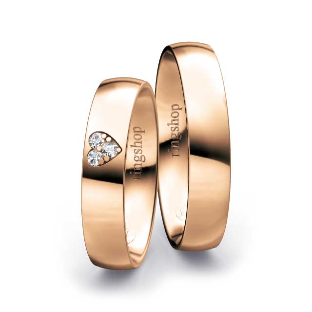 Rotgold: Es handelt sich um eine Legierung aus Feingold, Kupfer und Silber mit Goldanteilen zwischen 333/- und 750/-. Der etwas größere Kupferanteil sorgt für die namensgebende „rote“ Färbung und Härte des Materials. Der elegante und gleichermaßen zeitlose Farbton ist Kupfer ähnlich.